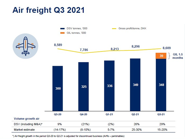 DSV achieved 29 percent volume growth in air freight in Q3 2021 (13 percent YTD 2021). “Adjusted for the addition of Agility GIL, we estimate that DSV’s growth figures were in line with the market.” Gross profit per unit (DKK) was almost flat at 8,609 and YTD was up marginally (2 percent) to 8,383.