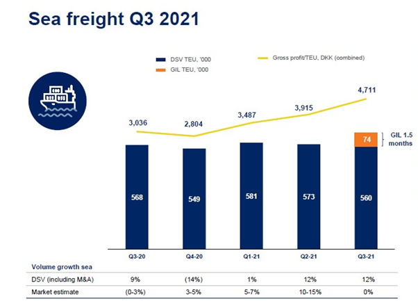 DSV achieved 12 percent volume growth in sea freight in Q3 2021 (8 percent YTD 2021). “Adjusted for the addition of GIL, DSV’s volume growth was flat and in line with the market, according to our estimates. Securing additional capacity has been a main obstacle to gaining new customers during 2021 as we prioritise existing customers.”