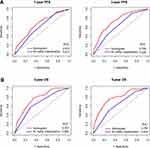 We then developed the nomogram of PFS and OS including the above corresponding independent factors (Figure 3). The RDW-based nomogram showed adequate predictive accuracy for PFS (C-index, 0.684; 95% CI, 0.635–0.734) and OS (C-index, 0.744; 95% CI, 0.685–0.803). ROC curve analysis revealed that the nomogram showed more accuracy than the Al-mefty classification in predicting PFS (Figure 4A) and OS (Figure 4B). Besides, calibration curves indicated well credibility of the RDW-based nomogram (Figure 5A and B). In addition, decision curve analysis revealed that the nomogram had a higher net benefit after including RDW (Figure 5C and D), suggesting the potential clinical value of the RDW-based nomogram.