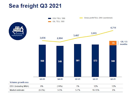 DSV achieved 12 percent volume growth in sea freight in Q3 2021 (8 percent YTD 2021). “Adjusted for the addition of GIL, DSV’s volume growth was flat and in line with the market, according to our estimates. Securing additional capacity has been the main obstacle to gaining new customers during 2021 as we prioritise existing customers.”