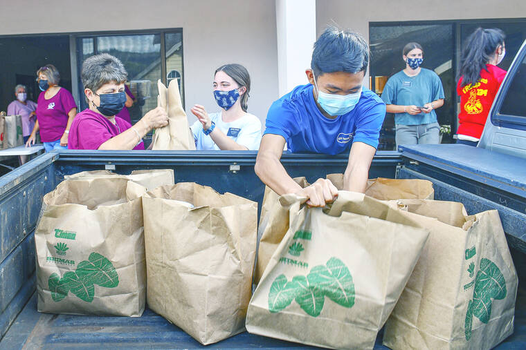 KALAHEO — Volunteers prepared for more than 75 families Friday during the once-a-month food distribution at the Holy Cross Church in Kalaheo.