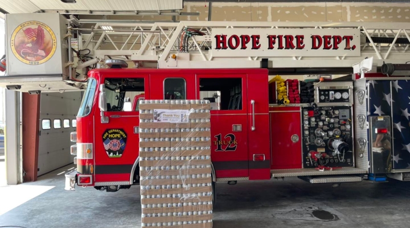 The Hope Volunteer Fire Department has received a donation of canned drinking water to support efforts to respond to wildfires.