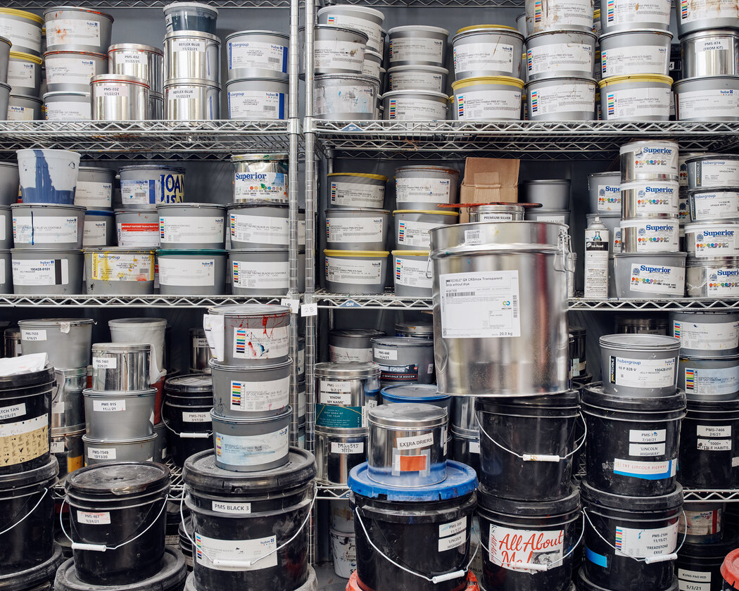About 800 different colors are stored in the ink room. Coral Graphics goes through approximately 2,500 pounds of ink every month.