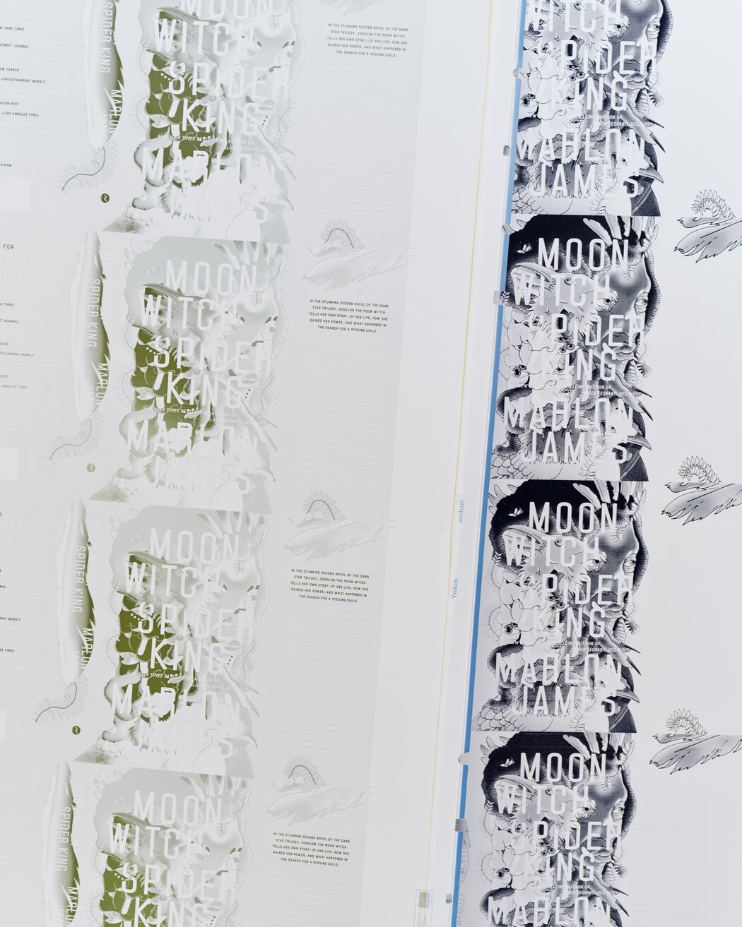 The book jacket was manufactured first. The cover of “Moon Witch, Spider King,” printed at Coral Graphics Services in Hicksville, N.Y., was unusually complicated, with a vivid mix of bright colors. James, who used to be a graphic designer, joked that his previous profession — and accompanying opinions — made him “the worst type of person” to consult on the cover.