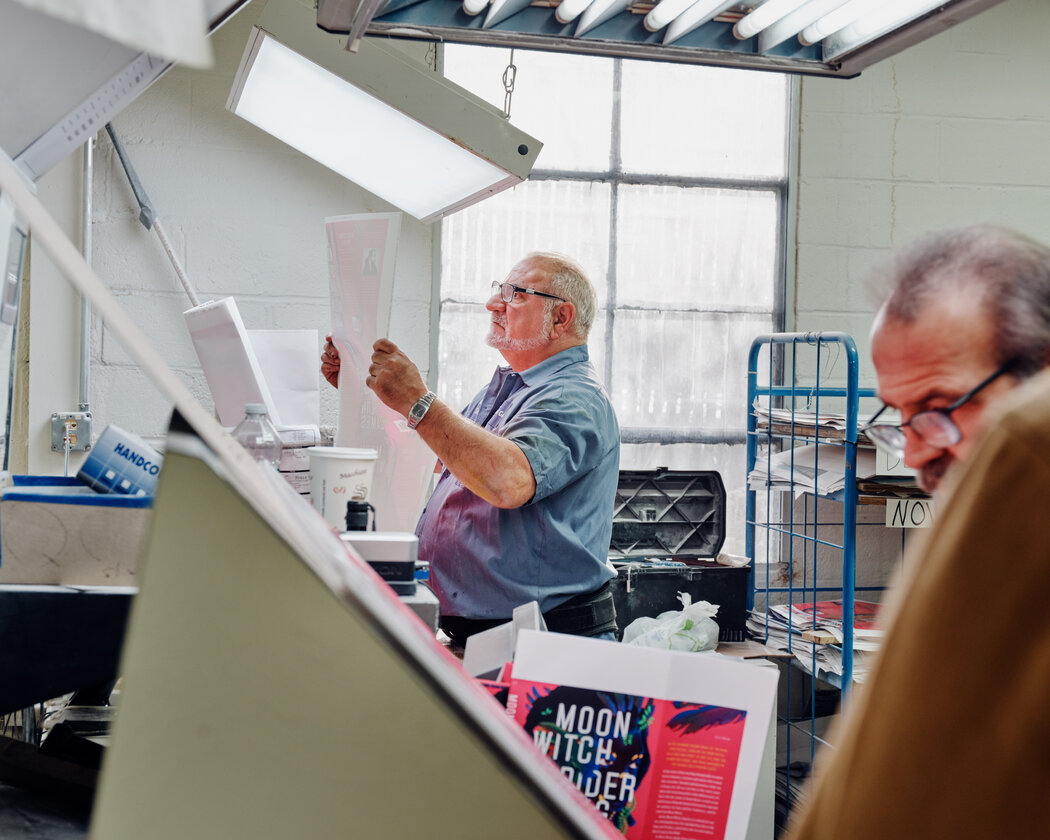 A press operator, Sal Peri, checks a proof before the print run begins.