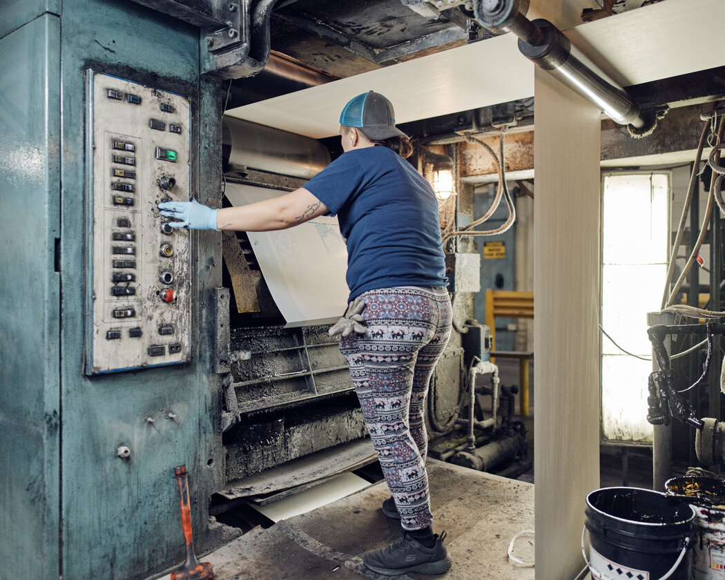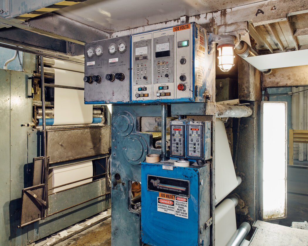 These giant rolls of paper have been lined up for a day of printing. The press itself is a goliath: It is 26 feet wide and 127 feet long, and weighs about 200,000 pounds. According to Lakeside, you could park six semi trucks in that machine, and it would take all six of those trucks to move it.