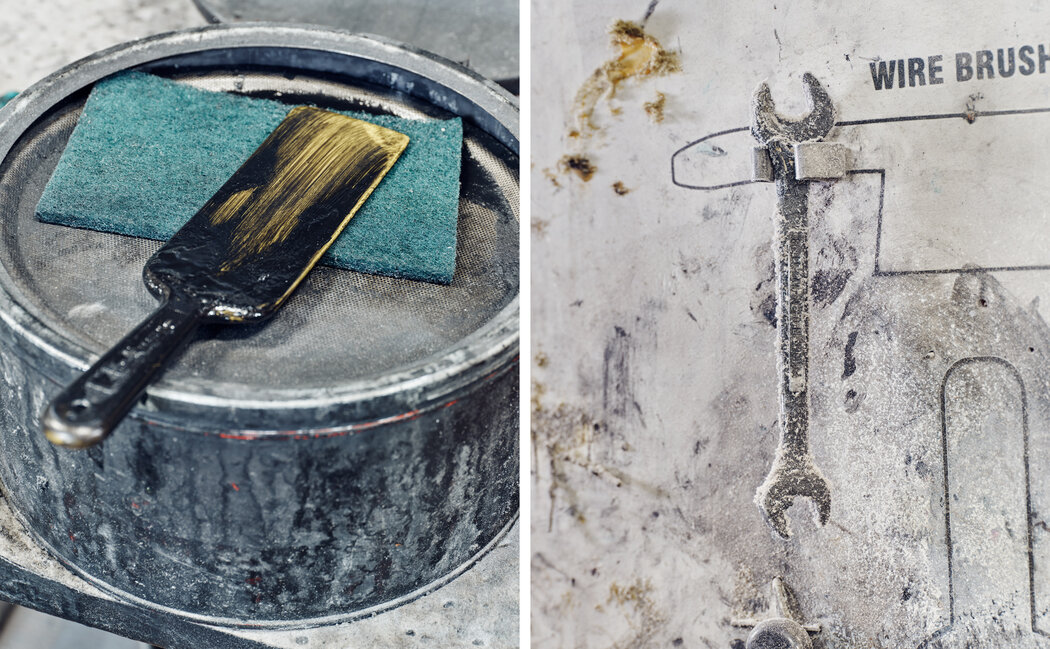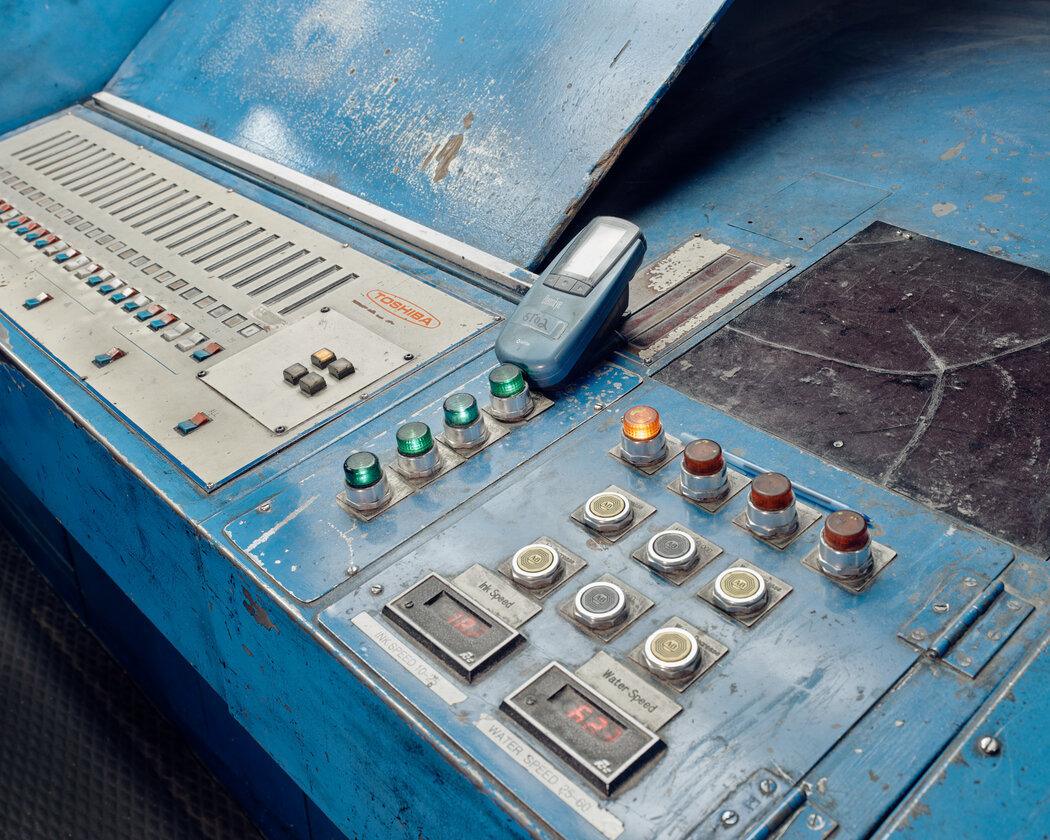 At this station, the pressmen can check how the ink is laying on the paper using a densitometer, the blue tool at the center that looks a little like a walkie-talkie, and can then make needed adjustments using the ink controls.
