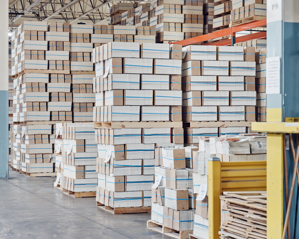 A stack of 40,000 printed covers waits to be laminated, which makes them more durable. On the right are rolls of laminate.