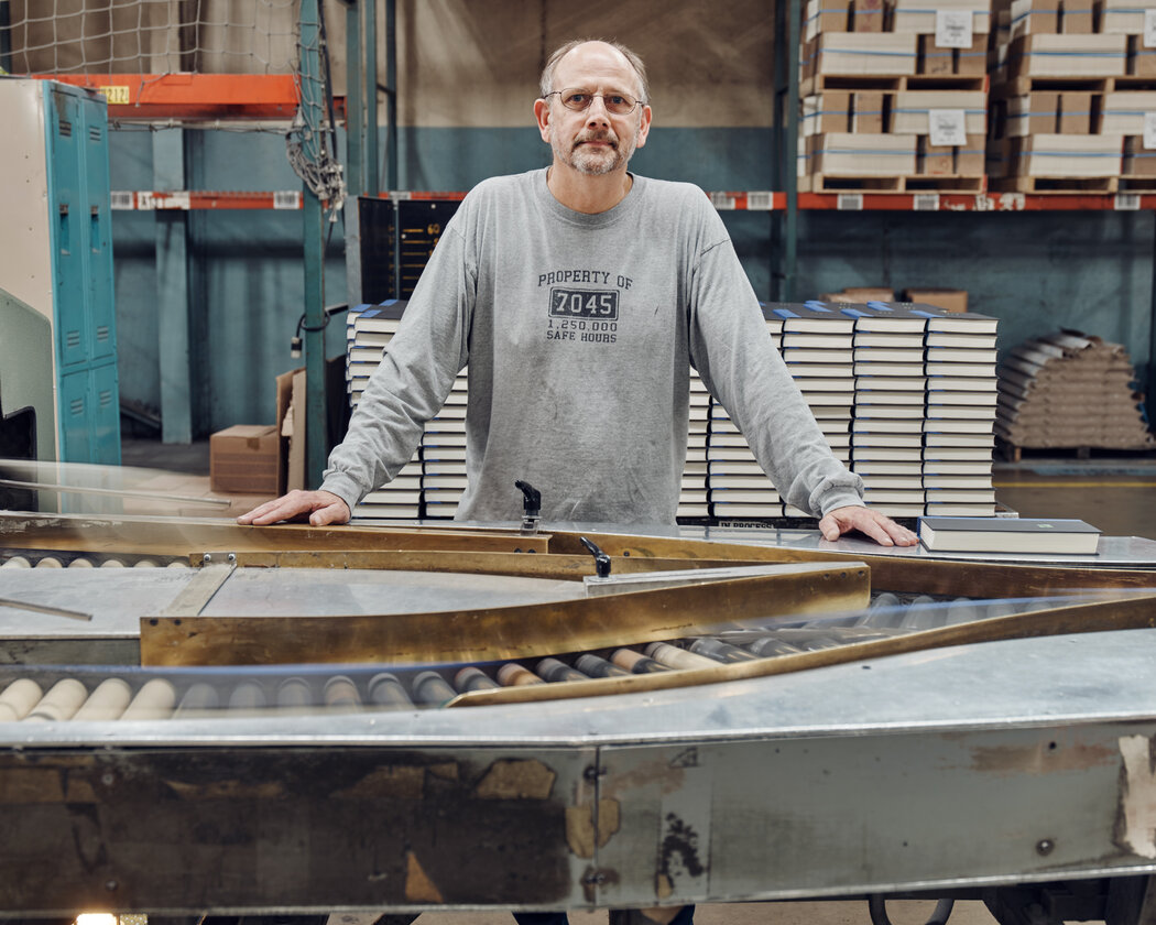 The cardboard cover is called the “case,” and the machine that attaches it the “case-in.” Mitch Strickler, a case-in operator, stands at one of his stations where he checks that the cases are being applied correctly.