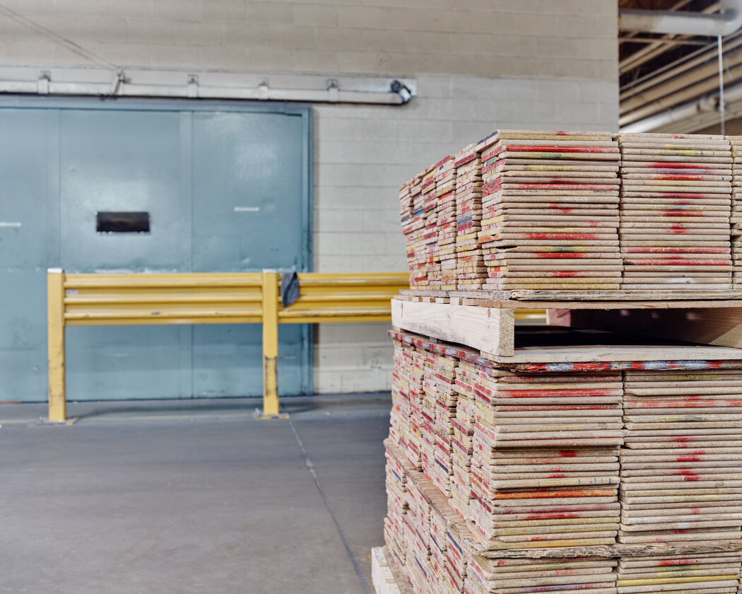 A stack of 32-page sections is lowered onto a bundle board. When the pile reaches a weight of about 30 pounds, another board is placed on top. Wrapped up as a unit, the stack then heads to the bindery.