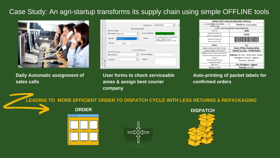 Unfortunately, sometimes, startups get taken in by fancy, new age data analytics tools and lose sight of the ultimate goal: to transform data into valuable insight. Surprising results can be achieved using minimal tools if you stay focused on this objective. Here is one such story of a Pune based agri-startup that used simple tools for breakthrough supply chain transformations. They conquered their data requirements with a combination of old workhorses: Microsoft Excel and Open Office tools.