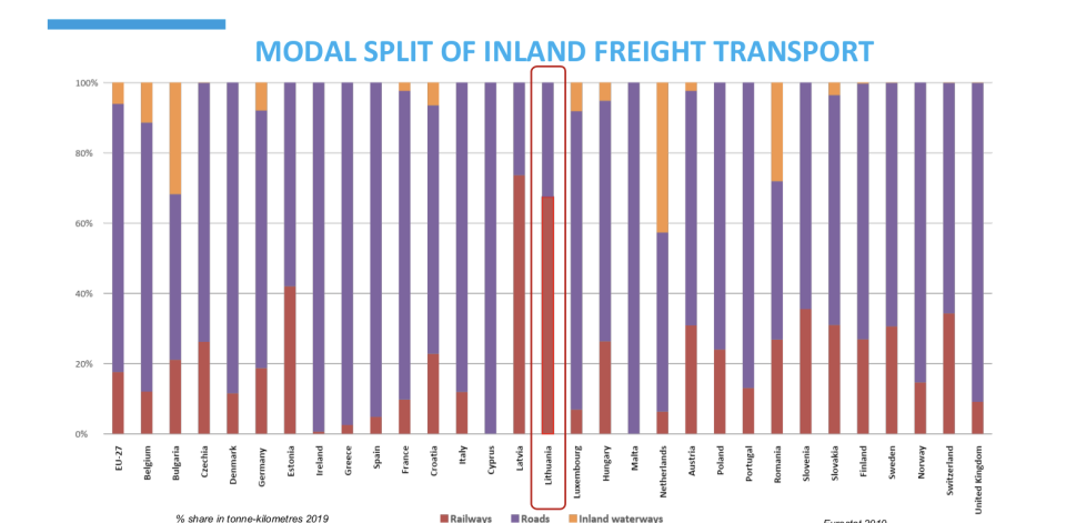 It is impressive to see a small country like Lithuania using rail freight for most of its inland transport operations. The modal split of rail reaches almost 70 per cent, positioning the country among the leading European states in using rail freight. Even countries like Germany, which are considered traditional rail freight forces, come second to Lithuania.