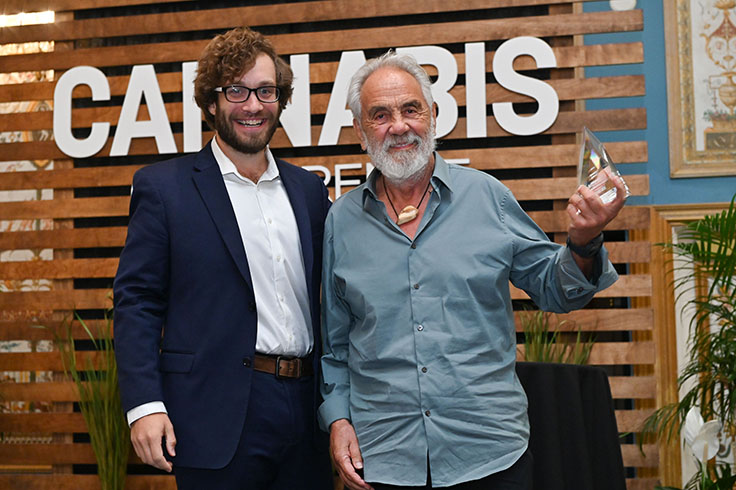 Cannabis Business Times and Cannabis Conference Digital Editor Eric Sandy honored Tommy Chong with the event’s final accolade of the evening: the inaugural Lifetime Achievement Award. During his remarks, Sandy shared with the audience an account of Chong’s decades of work as an activist through his entertainment career, his experience as an ancillary and plant-touching business owner, as well as the nine months he spent in federal prison between 2003-2004 (in addition to hefty fines and merchandise forfeiture) for selling glass pipes online via his business Nice Dreams Enterprises.