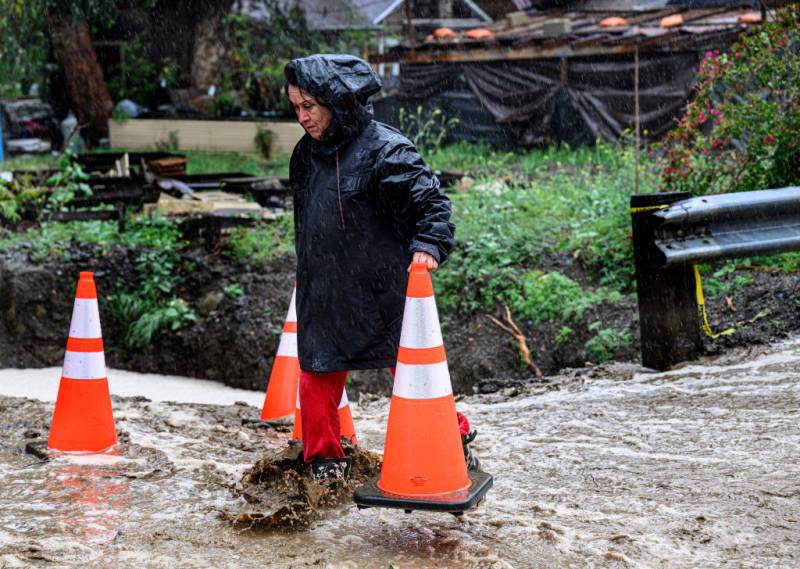 Bianca Kulback moves cones near her home on Silverado Canyon Road where water gushes off the mountainside on Monday, March 28, 2022. ( Photo by Mindy Schauer/MediaNews Group/Orange County Register via Getty Images)