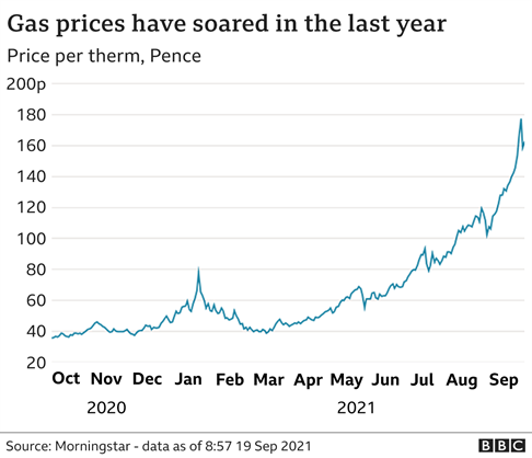 First, to say that natural gas prices are high in Britain is really quite the understatement. According to Industry group Oil & Gas UK, wholesale prices for gas in September were up 250 percent since January, and had increased 70 percent since August. As one UK energy CEO remarked, this is “the most extreme energy market in decades.”