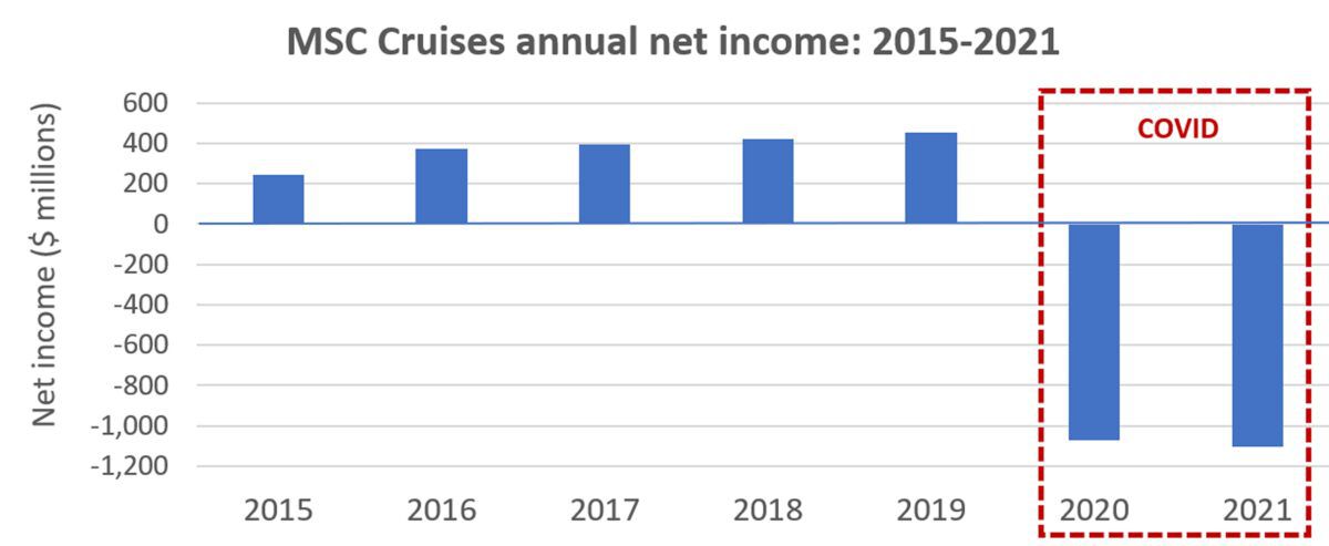Container shipping overall suffered significant losses in the years prior to COVID. During the five years from 2015-19, when container rates were very low, MSC Cruises posted aggregate net income of $1.89 billion, offsetting market pressure on the container side.