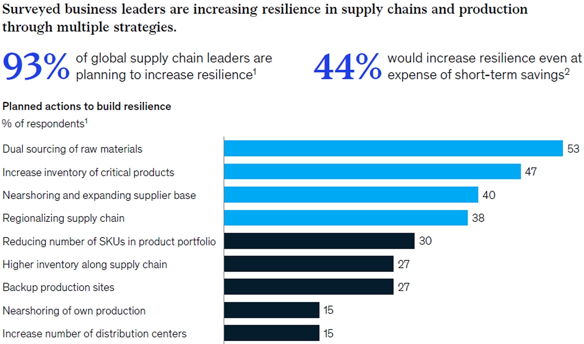 A McKinsey survey conducted in May found that 93% of respondants plan to increase resilience. Top strategies were dual sourcing of raw materials (53%), higher inventories (47%), nearshoring (40%) and regionalizing supply chains (38%).