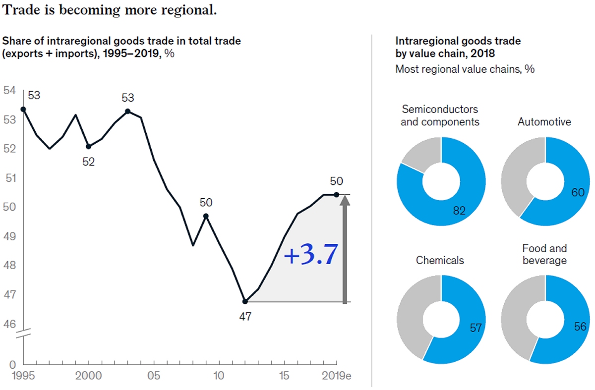 “Regionalization is ongoing,” explained Barriball. “You saw intraregional trade go from 47% in 2012 to about 50% [in 2019]. For freight carriers in long-distance global trades, it would be prudent to start thinking about scenarios where we come out of COVID and see even more regionalization of supply chains.”