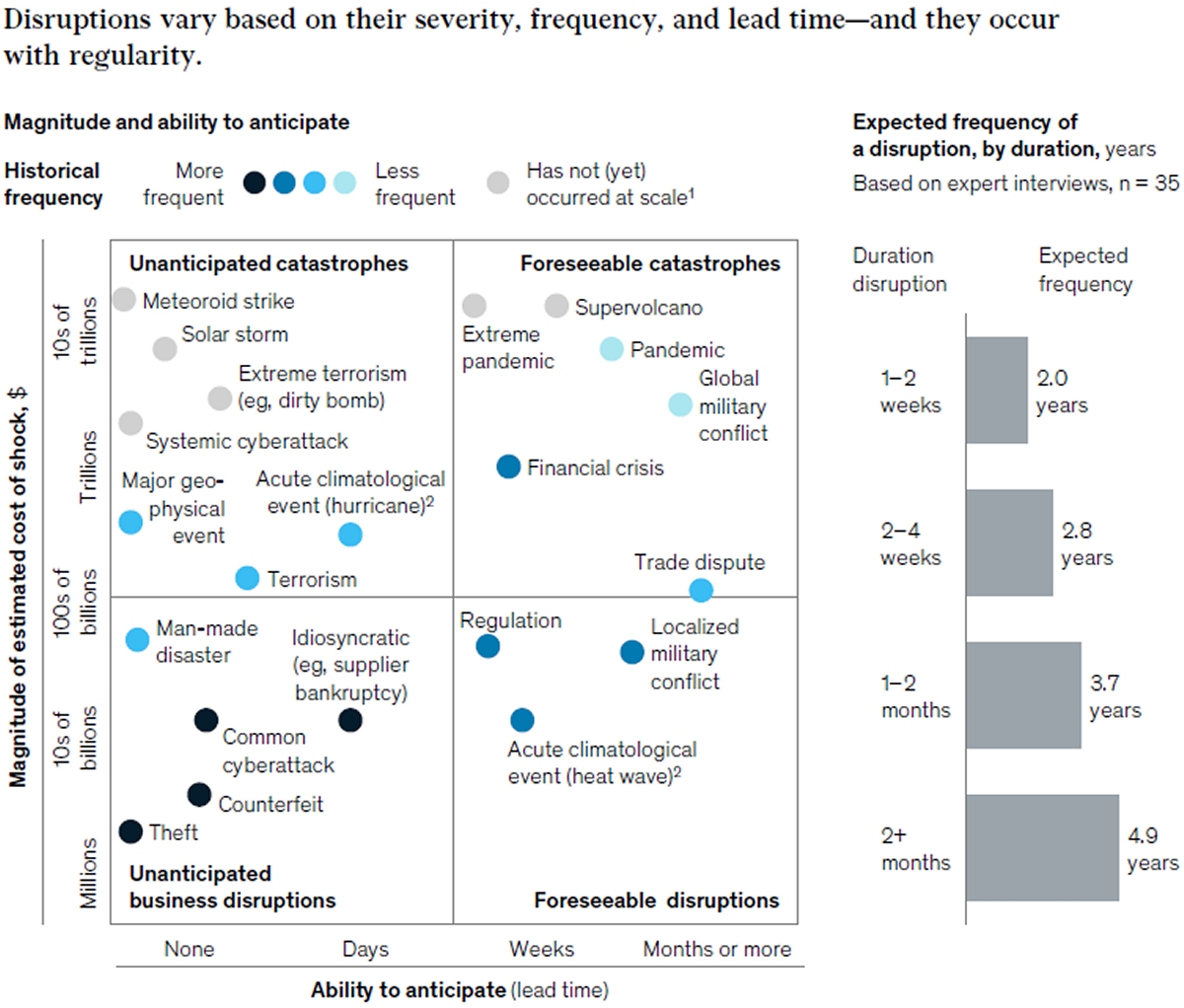 MGI estimated that once each decade, disruptions could erase 40% of a year’s profits for some companies. Severe events occurring every five to seven years could erase almost an entire year’s profits for companies in some industries.