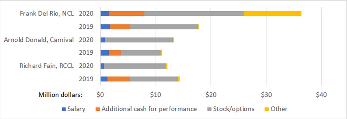 Executive compensation in the cruise sector is on a whole different — much higher — level than in commercial shipping. CEO annual compensation is in the eight digits, not seven.