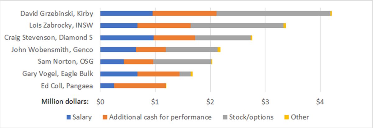 Most of the bulker and tanker owners listed in the U.S. are foreign filers, meaning that they only have to disclose the aggregate compensation of the executive team.