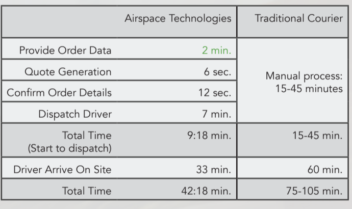 “Traditionally, medical couriers request 60-90 minutes for the driver to arrive on site after the order has been dispatched. Airspace goes a step further and guarantees to have a driver arrive on-site for pickup within 60 minutes in all major metro areas,” according to a recent white paper the company produced about eliminating on-demand shipping delays. “Due to Airspace’s Auto Dispatch, the time it takes for a driver to arrive on-site for pickup is 33 minutes, on average, in the Denver market. Auto Dispatch enables shipments to be picked up faster and ultimately cut down on the total transit time to help eliminate delayed shipments.”