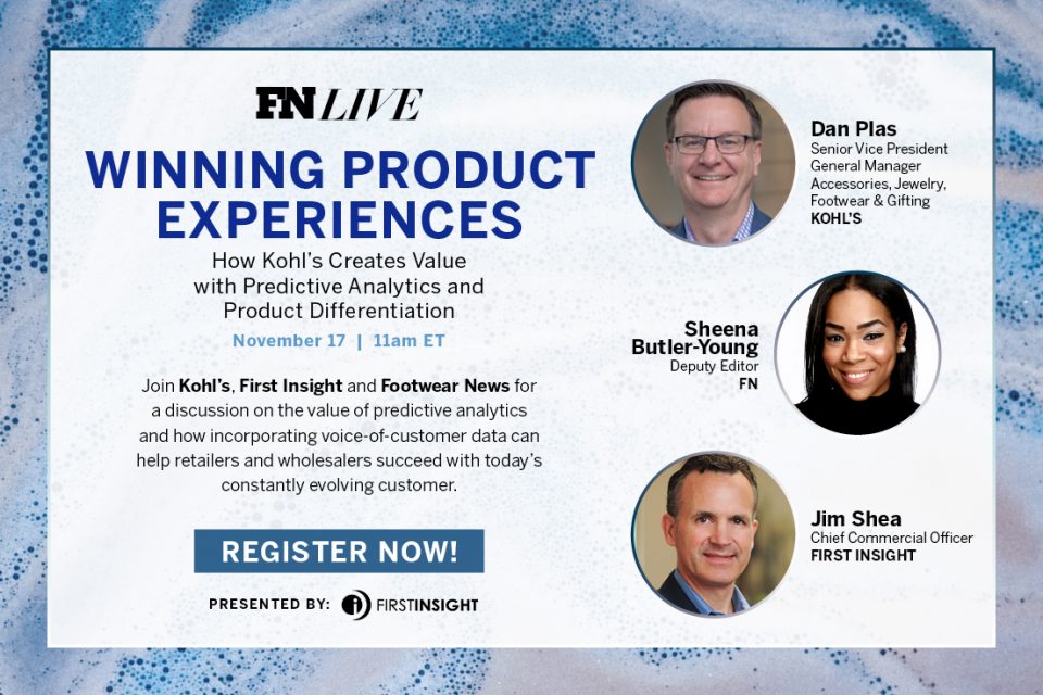 In today’s webinar from FN, “Winning Product Experiences: How Kohl’s Creates Value with Predictive Analytics and Product Differentiation,” experts from Kohl’s and First Insight discussed just how to adopt this forward-thinking approach. The conversation was moderated by FN deputy editor Sheena Butler-Young and featured Dan Plas, SVP and general manager of accessories, jewelry, footwear & gifting at Kohl’s, and Jim Shea, chief commercial officer of First Insight.