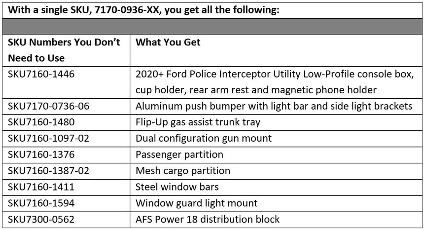 Outfitters and installers for law enforcement vehicles will find that using the Single SKU Package to outfit law enforcement vehicles provides many advantages: