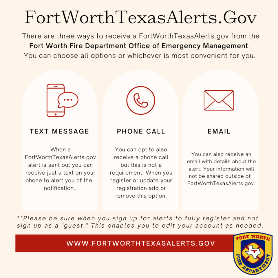 The City of Fort Worth, through the Office of Emergency Management, has a free alert system called Fort Worth Texas Alerts. This system replaced the NIXLE system. If residents were previously registered for NIXLE alerts, they will need to register for this system in order to receive emergency notifications. Register for texts, phone calls, email or a combination of all three.