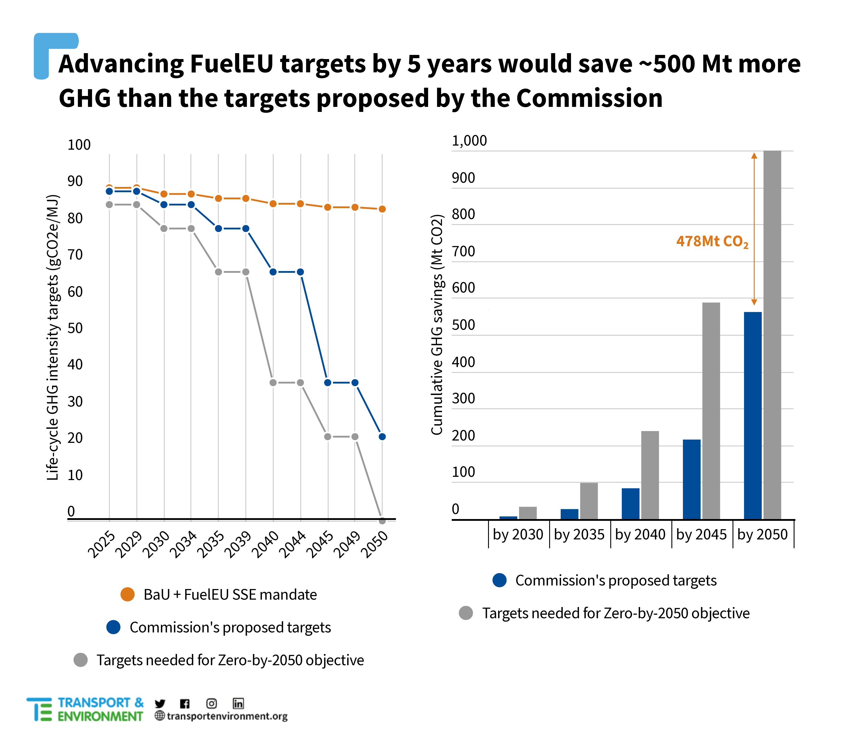 For FuelEU Maritime, in practice, this means agreeing on at least a 6% e-fuel mandate for 2030, strengthening the GHG reduction targets by advancing them by five years and discontinuing the proportion of fossil liquified natural gas (LNG) in shipping.