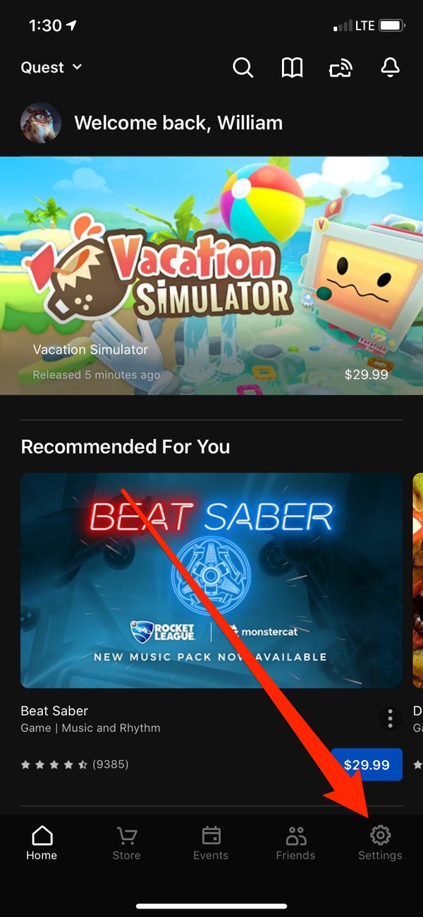 1. Open the Oculus app on a device that’s paired with your headset and open the “Settings” menu.