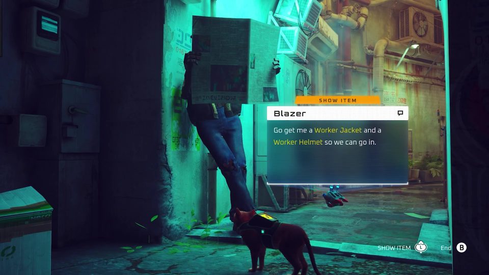 Now you can head back to Blazer and give him both the Worker Helmet and the Worker Jacket. He will then be able to smuggle you into the Neo Corp Factory.