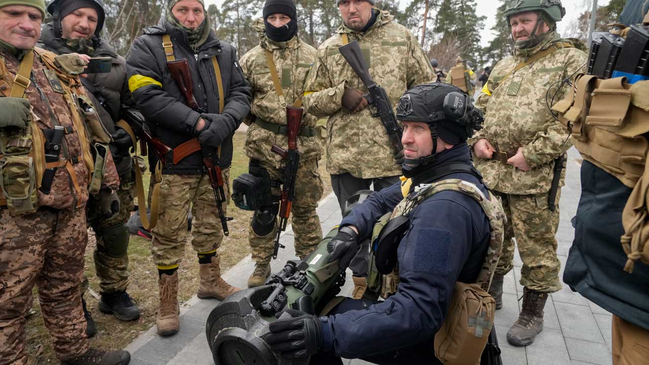 Ukrainian Territorial Defence Forces members train to use an NLAW anti-tank weapon on the outskirts of Kyiv, Ukraine, Wednesday, March 9, 2022. (AP/Efrem Lukatsky)