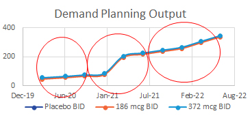 For the GCS operations team, planning for packaging runs is usually based on quantities of clinical supplies needed over time. Inputs such as enrollment rates, numbers of sites, dispense visits, etc., are used to calculate the amount of product needed to support the trial over time, either via Excel sheets or simulation programs. Then, other factors such as expiry dates and bulk inventory are considered while packaging runs are scheduled either internally or with a packaging partner. Typically, the main output of the operations plan is N, or the number of kits needed for each treatment group. In the example above, the total N for the study is about 375, and the three red circles are the scheduled packaging operations of N=175, N=125, and N=75. These plans are typically updated as the study progresses, new sites add or drop, new countries join, shelf-life changes, etc.