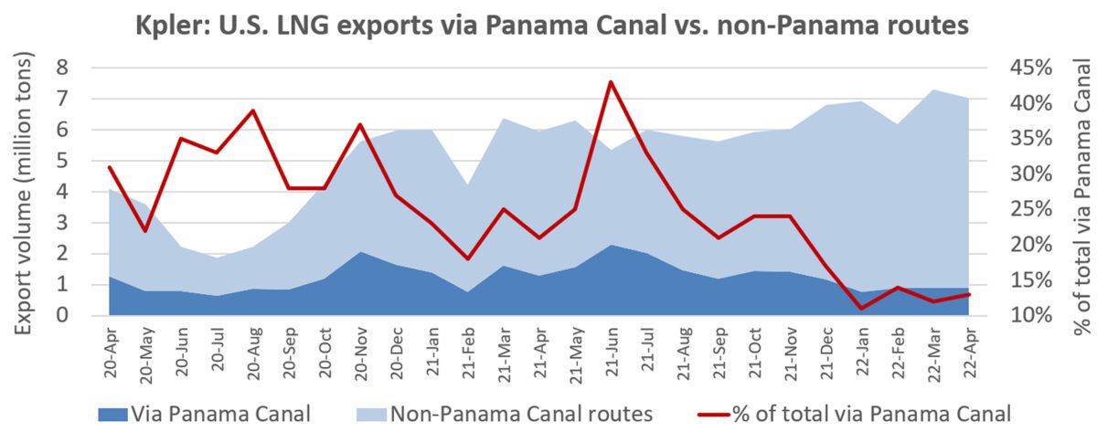 Commodity data provider Kpler compiles data on total U.S. LNG export volumes and the portion of those volumes that transit the Panama Canal. While ACP data only goes through March, the Kpler data shows that the canal had another very bad month for LNG transits in April. Kpler’s data shows that total monthly U.S. LNG exports rose 31% from 5.36 million tons in June 2021 to 7.03 million tons in April, but the share going through the canal fell from 43% last June to just 13% last month.