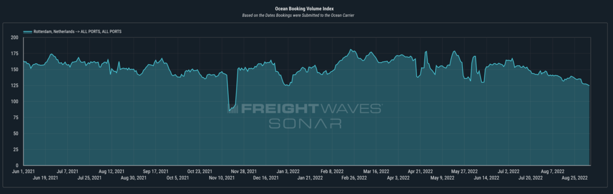 Upstream ocean container bookings data from FreightWaves Container Atlas reveals that European exports are set to slow markedly as well. Ocean container bookings outbound from Rotterdam to all global ports have experienced downward pressure since July: