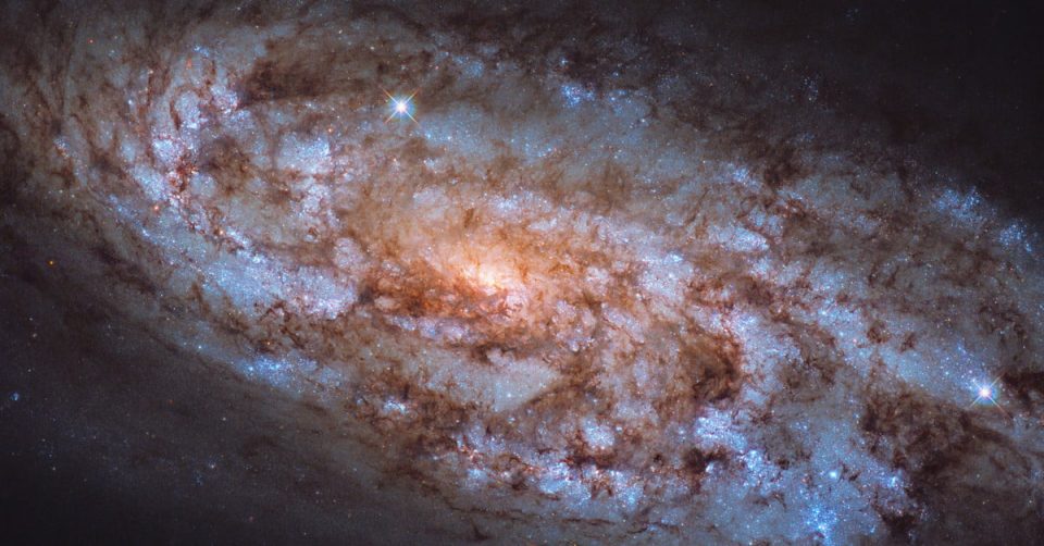 An orange glow radiates from the center of NGC 1792, the heart of this stellar furnace. Captured by the NASA/ESA Hubble Space Telescope, this intimate view of NGC 1792 gives us some insight into this galactic powerhouse. The vast swathes of tell-tale blue seen throughout the galaxy indicate areas that are full of young, hot stars, and it is in the shades of orange, seen nearer the center, that the older, cooler stars reside.