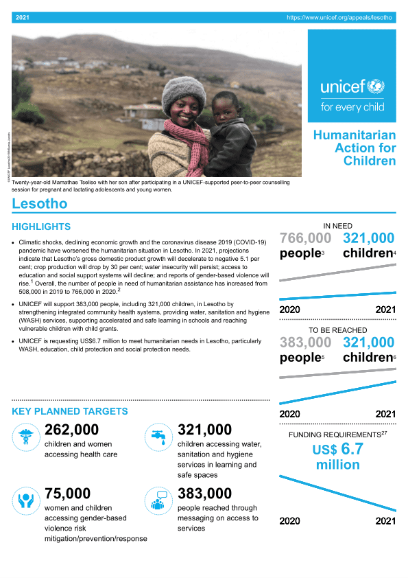 UNICEF will support 383,000 people, including 321,000 children, in Lesotho by strengthening integrated community health systems, providing water, sanitation and hygiene (WASH) services, supporting accelerated and safe learning in schools and reaching vulnerable children with child grants.