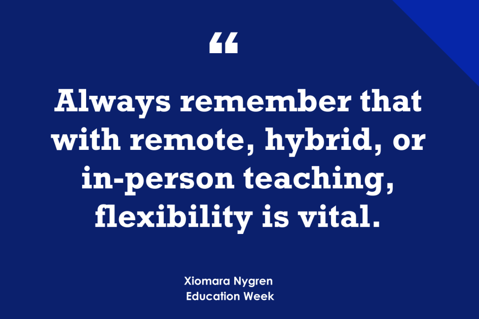 Always remember that with remote, hybrid, or in-person teaching, flexibility is vital. Some days, one thing works well, and the other not so much. Students are very understanding and appreciate the camaraderie of working through this together.