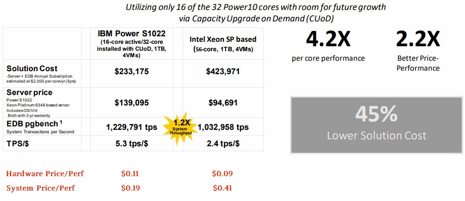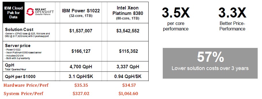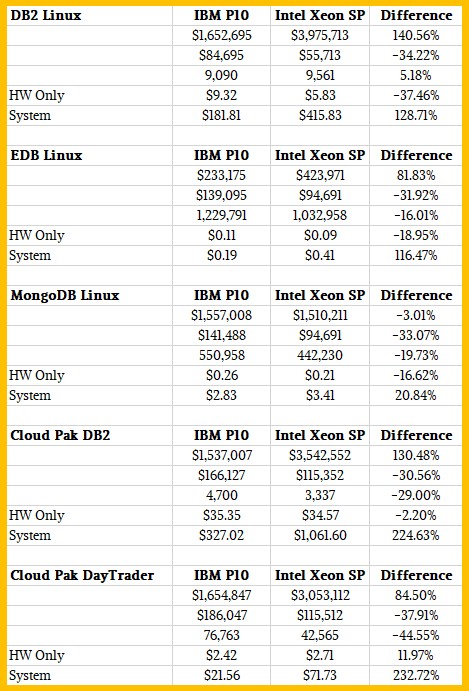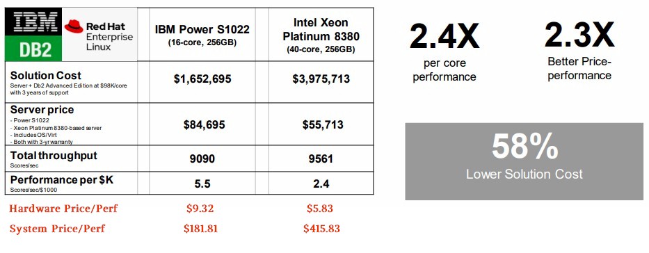 IBM did not calculate the price/performance for the hardware alone, and for obvious reasons: IBM Power machines are more expensive than analogous X86 machines. In this case, the Ice Lake Xeon SP hardware shown is 34 percent cheaper for roughly similar performance. Which sounds bad, until you add the cost of DB2 Advanced Edition, which costs a whopping $96,000 per core with three years of support. The Xeon SP machine has 40 cores instead of 16 cores with the IBM Power10 machine, so the software license bill skyrockets and when it is all done, the Xeon SP machine costs 2.3X more to do 5.2 percent more work.