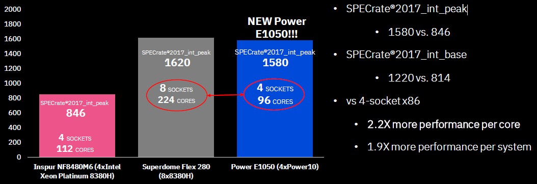 The point is, both IBM Power and Intel Xeon SP had roadmap delays caused by foundry issues – IBM with the 10 nanometer and then 7 nanometer processes from GlobalFoundries, which never made it to market with either, and Intel with its own 10 nanometer issues. So things are a bit out of whack compared to historical trends. But, in terms of raw performance, the 2X rule for Power cores is holding, as is attested by the performance ratings for the Power E1050 shown above.