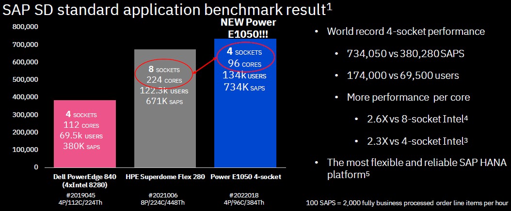 In any event, on the SAP SD test, the Power E1050 had 1.9X more system throughput and 2.3X more per core performance than the Xeon SP machine. (Obviously, an Ice Lake system would have closed some of that gap, and so will a Sapphire Rapids NUMA machine). But on a big eight-way machine, even with core improvements and clock speed boosts, the IBM machine is delivering 2.6X the performance per core, and 1.9X more system throughput on the SAP test.
