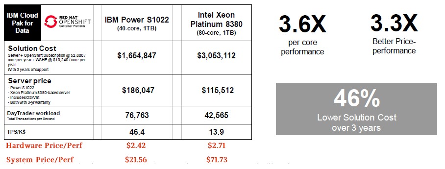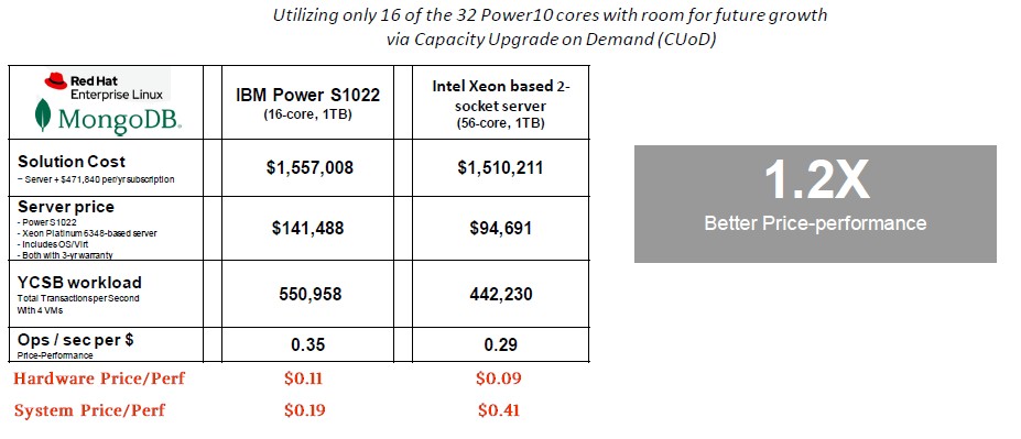 On this test, IBM is pitting a 32 core Power S1022 machine with only 16 cores activated against an X86 system with a pair of Ice Lake Xeon SP-6348 Gold processors. (The chart says Platinum, but it is Gold.) Both machines have 1 TB of memory, are running Red Hat Enterprise Linux, and have four virtual machines set up on the systems. The IBM machine does 19 percent more work, but the Intel machine costs 32 percent less and when the math is done, the Intel hardware is 19 percent cheaper than the IBM hardware. But fully burdened with software and support, then the Intel system costs 2.16X as much as the IBM system because of software licensing by core.