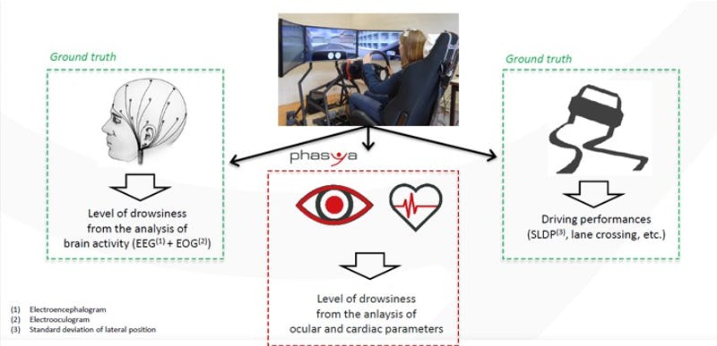 The image below shows the set up that Phasya uses to develop its ground truth data. The driver’s conditions are monitored using EEG/EOG during a simulation drive. This ground truth forms the basis Phasya’s algorithms, enabling it to draw physiological and cognitive judgements about the driver.