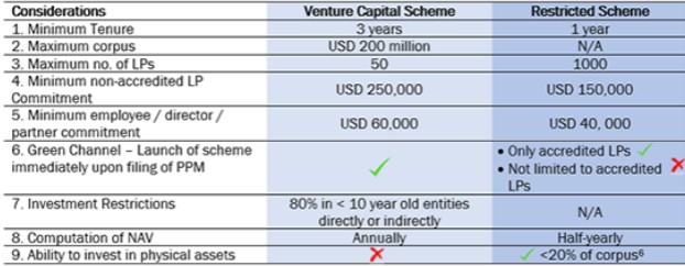The key differences between a Venture Capital Scheme and a Restricted Scheme (which is also for funds allocating towards start-ups) are provided below: