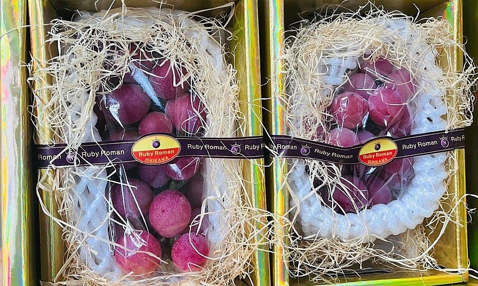 Many fruit shops in Hanoi and HCMC are selling Ruby Roman grapes, exclusive to the Japanese prefecture of Ishikawa, at VND550,000-700,000 (US$23.4-29.8) a bunch that weighs 400-700 grams.