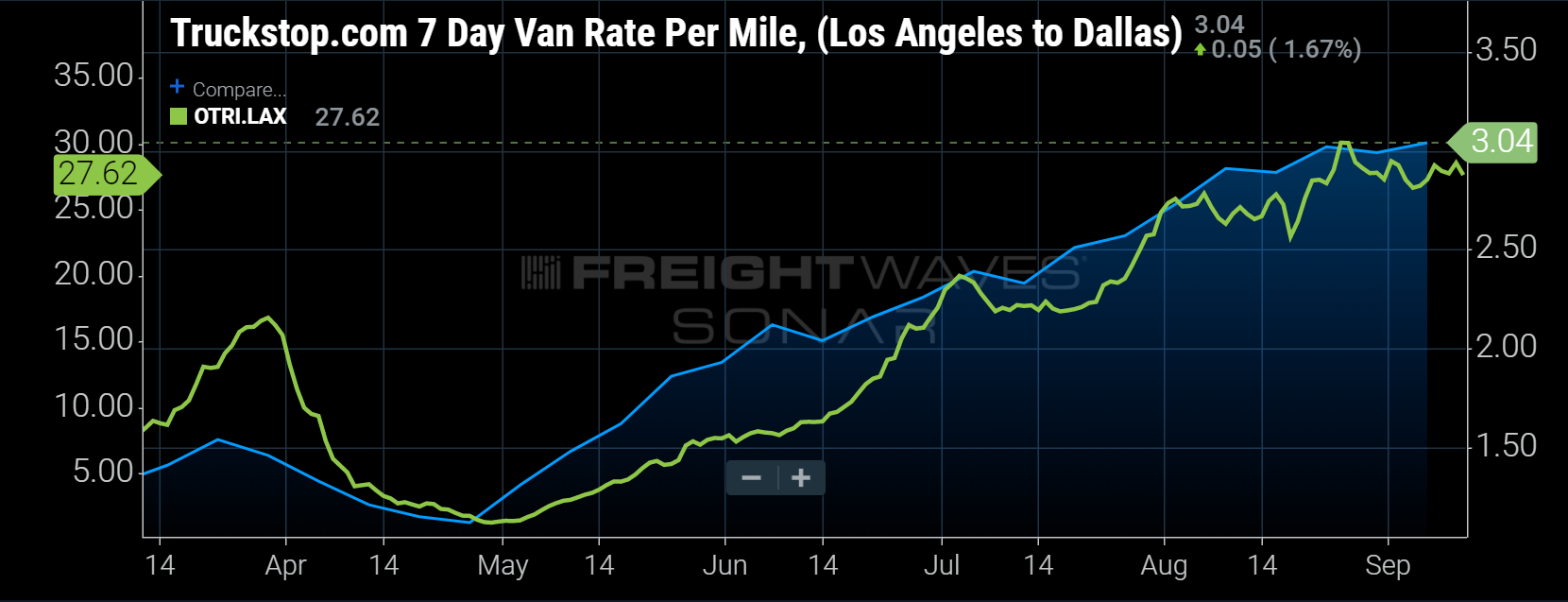 All-in dry-van spot rates in the highly liquid Los Angeles-to-Dallas lane have climbed steadily from $1.12/mile in April to $3.04/mile by the first week of September, according to Truckstop.com. FreightWaves Outbound Tender Rejection Index (OTRI) showed an increase from 1.2% to 27% over the same period.