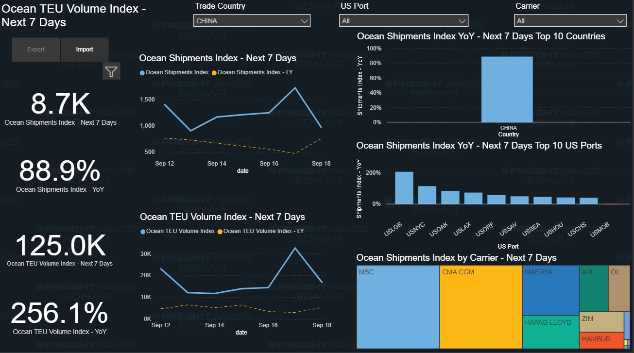 According to the FreightWaves Ocean TEU Volume Index, bookings of U.S. imports from China are up 89% year-over-year (y/y) through next week, which is a good indication that freight volumes will continue to flow through the rest of September.
