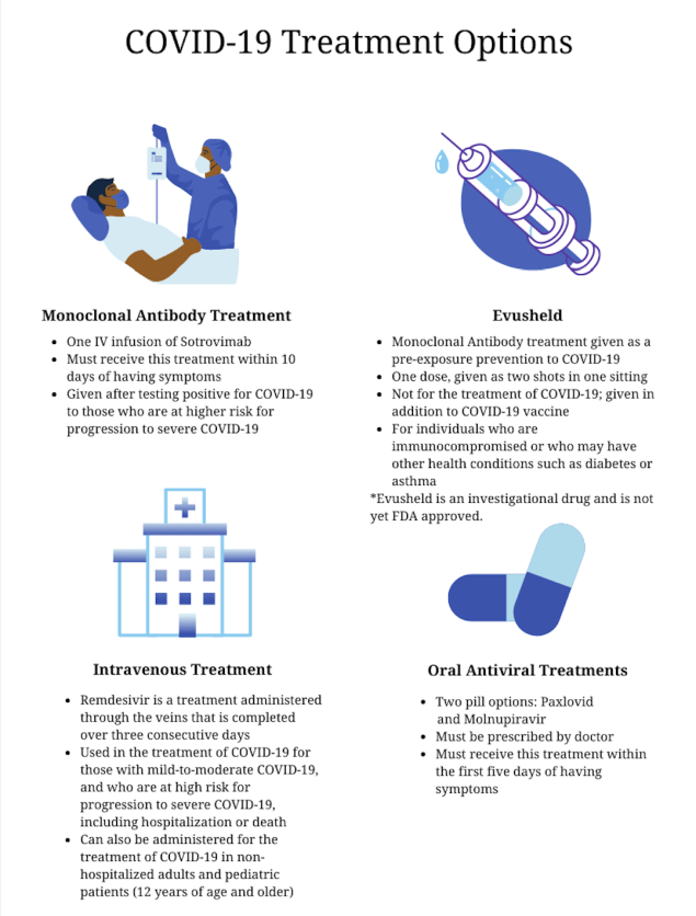 In addition to monoclonal treatments, there are other treatment options such as an oral antiviral treatment and Remdesivir. Oral antiviral treatments are pills that can be taken if an individual tests positive for COVID-19 and is effective if taken within five days of having symptoms. There are two types of antiviral treatments: Pfizer’s Paxlovid and Merck’s Molnupiravir, which can only be obtained with a prescription from a doctor.