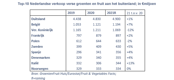 Top 10 overseas Dutch fresh fruit and vegetable sales, in € millions. From top to bottom: Germany. Belgium, UK, France, Poland, Sweden, Spain, Denmark, Italy, Norway. Source: Fresh Produce Center/Eurostat/Fruit & Vegetable Facts; R = Estimate.